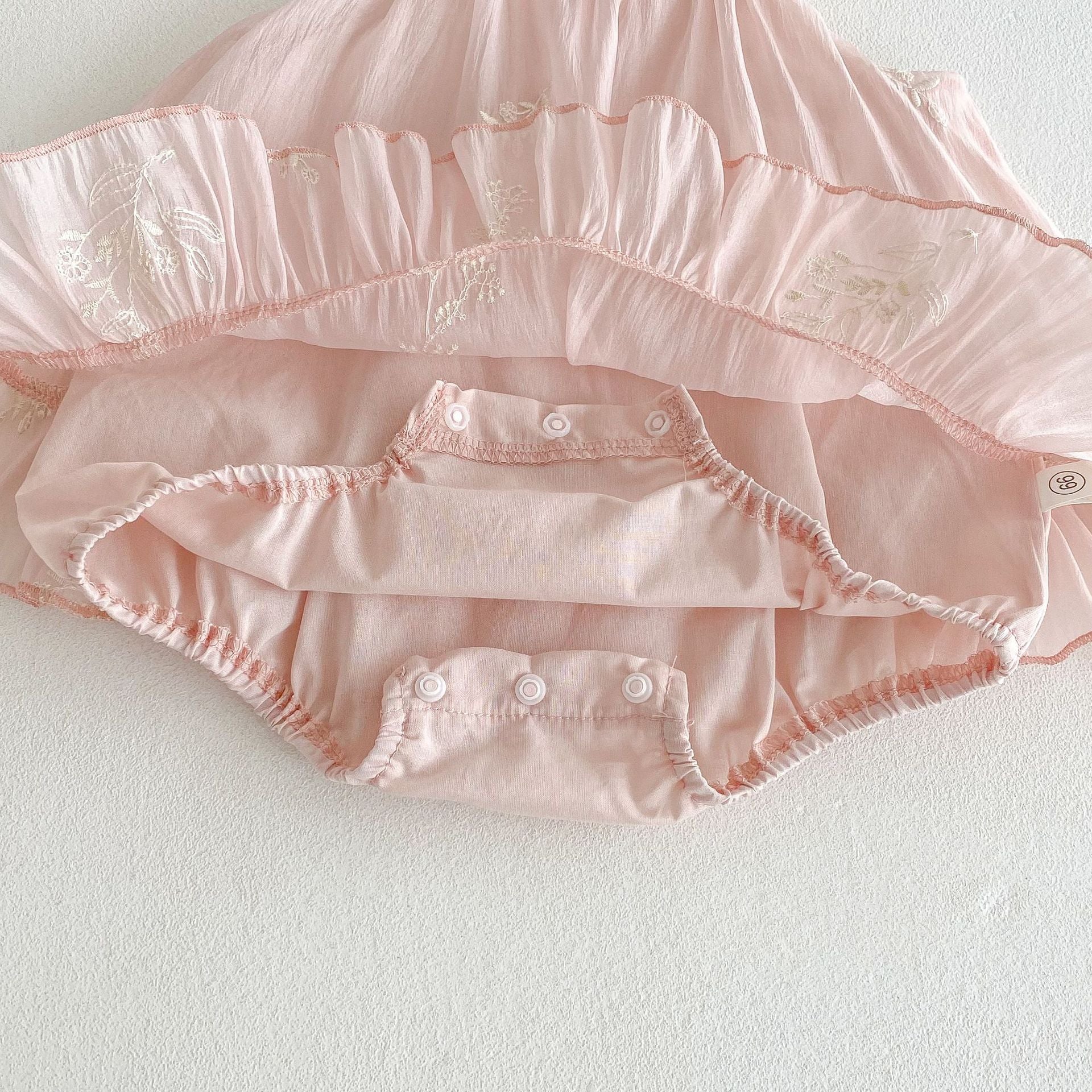 Elevate your little one's summer wardrobe with our exquisitely crafted pink onesie. Featuring delicate floral embroidery and thoughtfully designed short sleeves, this garment combines refined aesthetics with practical comfort. The premium cotton construction ensures breathability during warm weather while the subtle feminine details make it an essential piece for discerning parents who appreciate sophisticated infant apparel.